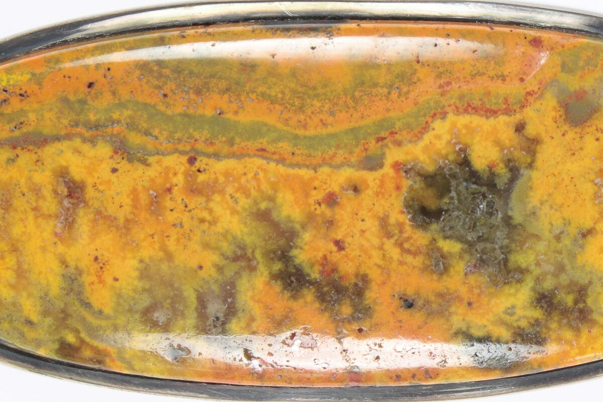This is a 2.1" tall polished bumblebee jasper pendant set in 925 sterling silver. The material was mined from Mount Papandayan in West Java, Indonesia.