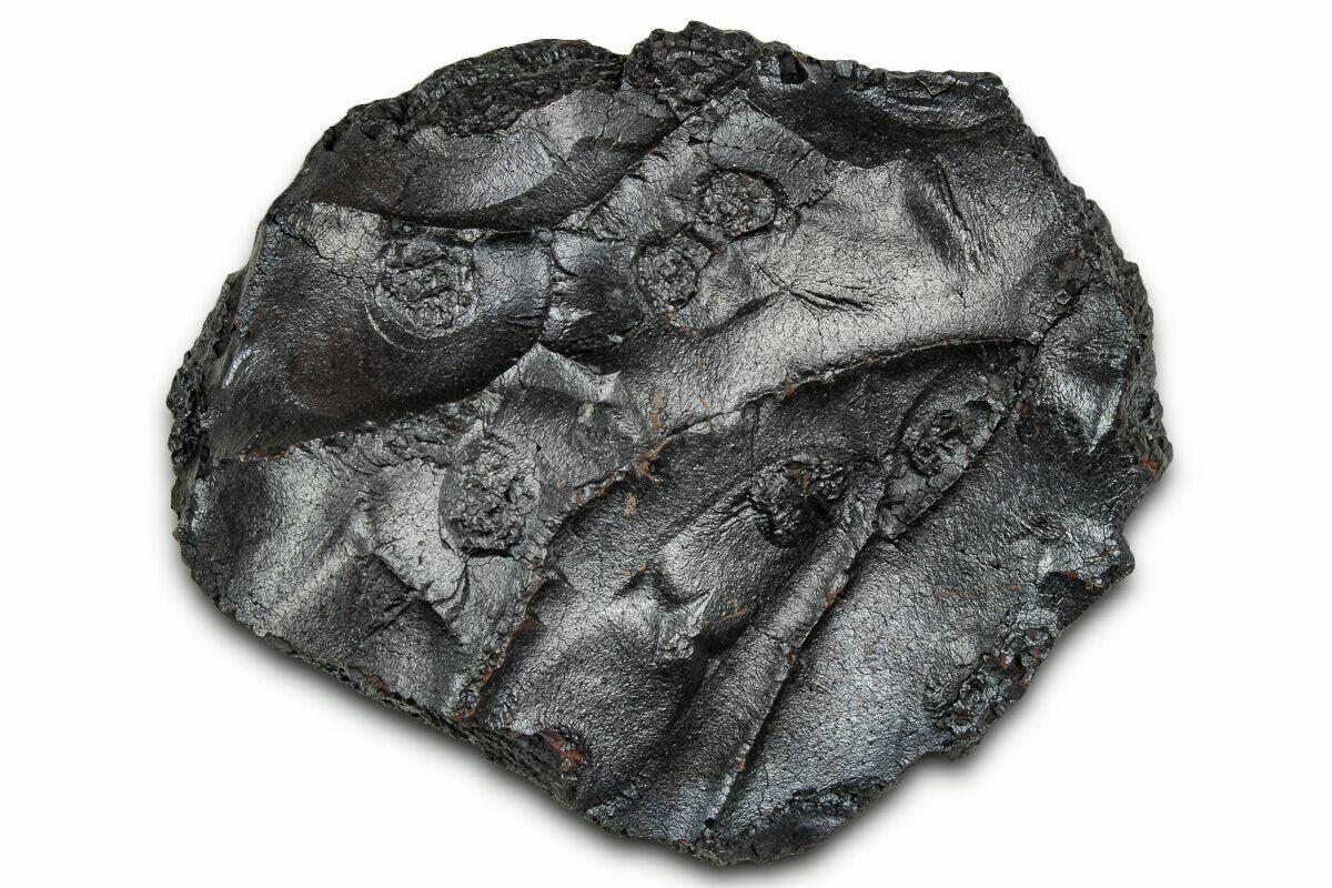 Dragon scale stone is the trade name of this type of iron nodule found in the Hell Creek Formation of North Dakota. They are found alongside dinosaur bones throughout the Hell Creek deposits, often lying next to dinosaur remains. Despite their name, these stones have nothing to do with dragons aside from their unique polygonal patterning, reminiscent of dragon scales. Their composition is primarily iron oxide with a siderite core and manganese/iron oxides that give them their dark red-brown patina.