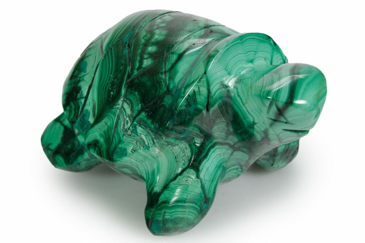 Swimming out of the ocean and crawling up your beach is this nicely carved turtle made from malachite collected from the Democratic Republic of the Congo. This is a sturdy, miniature piece that highlights the beauty of malachite with a nice, even polish. From rough mineral to polished piece, the malachite was worked by an expert craftsman to produce this statue reptile ready for display on the shelf or in the office.