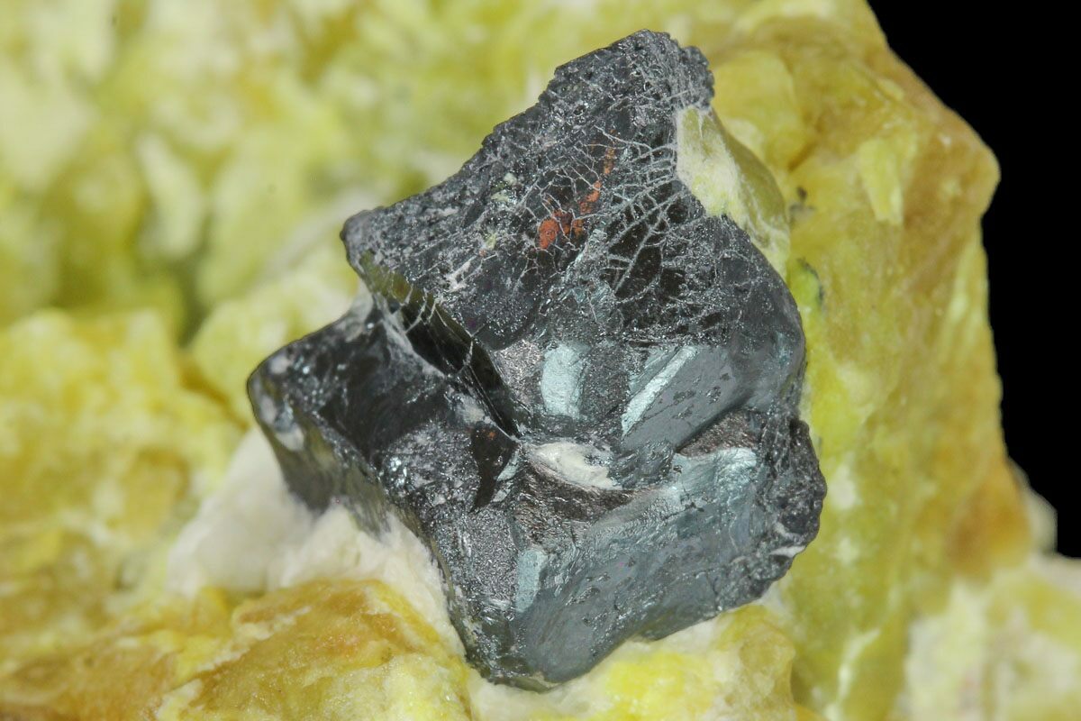 This is a 2.1" wide specimen that contains hematite crystals (pseudomorph after Ilmenite) that are partially encased by a lizardite (yellow-green) and hydrotalcite (white) matrix. This beautiful specimen was collected from the Øvre Dypingdal Mine (Dypingdal Serpentine-magnesite deposit) of Buskerud, Norway.