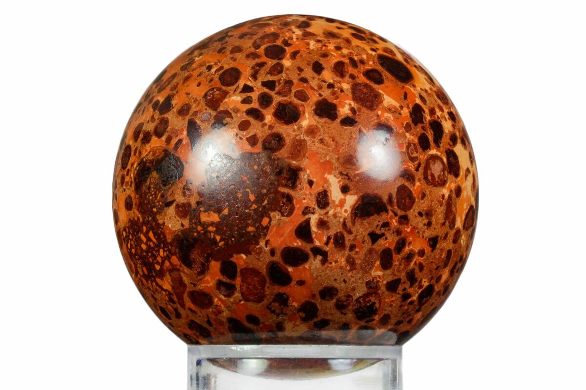 This is an incredible polished sphere made of bauxite (aluminum ore) mined in Russia. It is old collection material that was provided in its rough form and later polished to a glossy-finish. The polish brings out the spherical, red-brown ore bodies which contrast beautifully against the red-orange matrix. Seldom is this beautiful material found on the market.