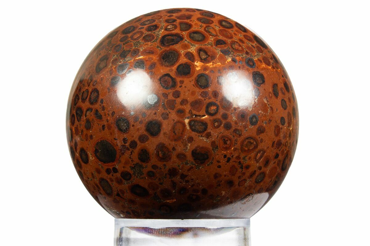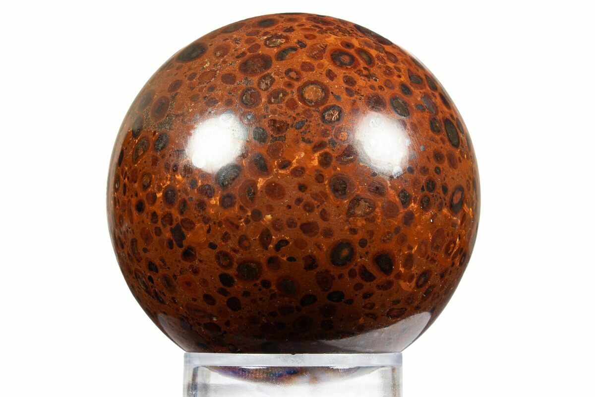 This is an incredible polished sphere made of bauxite (aluminum ore) mined in Russia. It is old collection material that was provided in its rough form and later polished to a glossy-finish. The polish brings out the spherical, red-brown ore bodies which contrast beautifully against the red-orange matrix. Seldom is this beautiful material found on the market.
