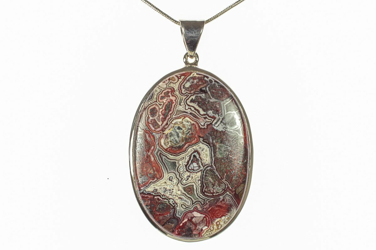 This is a beautiful, polished "crazy lace" agate pendant, also known as Mexican Agate, collected from Chihuahua Mexico and set in sterling silver. The patterns and lacing of this specimen are stunning, and it would be a wonderful addition to any agate collection.