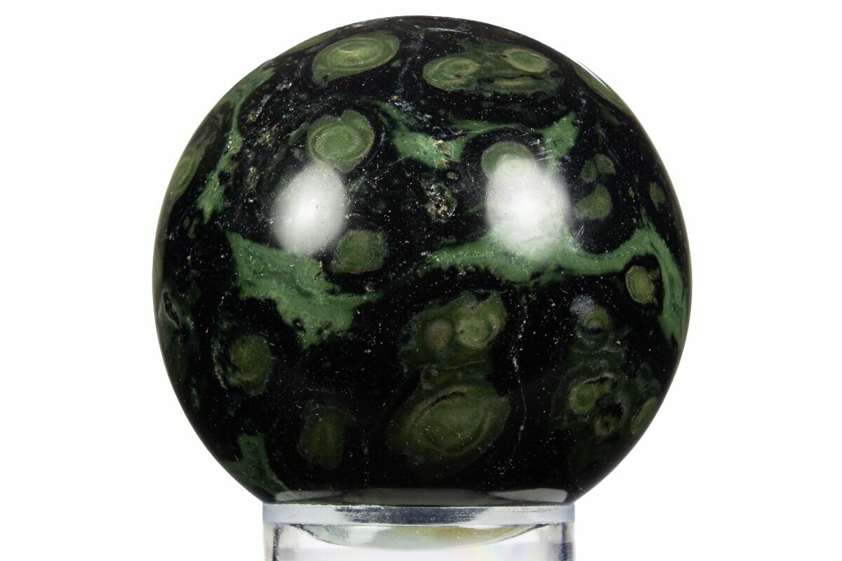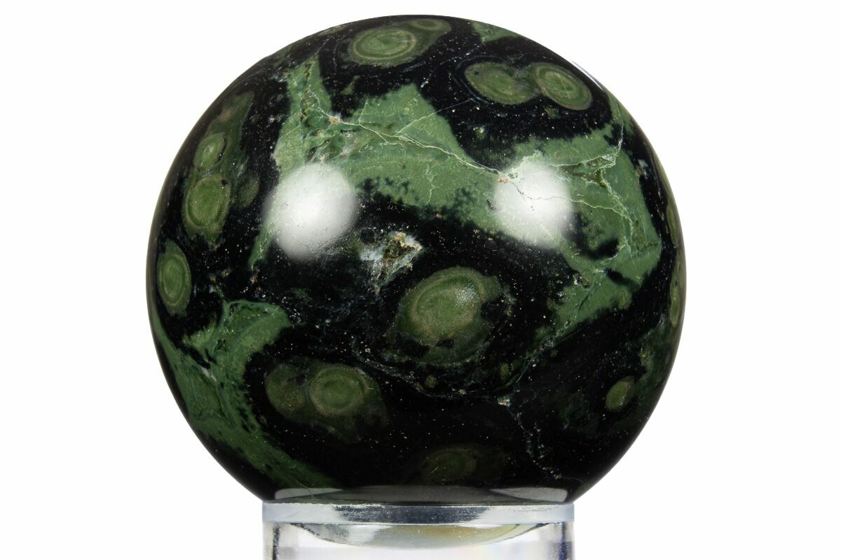 This is a beautiful hand polished sphere made from kambaba jasper found in Madagascar. It is 2.1" wide and has dark circular mineral formations throughout the green matrix.