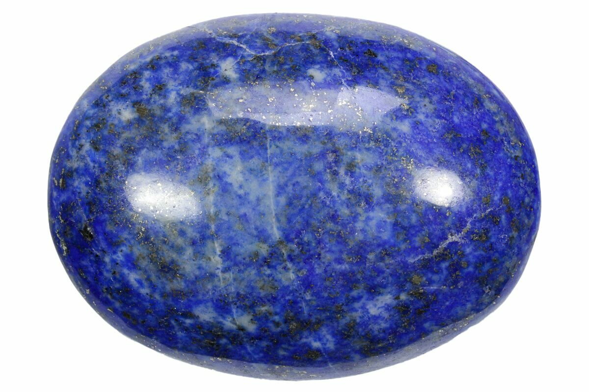 This is a 2.1" wide, polished lapis lazuli palm stone with streaks of sparkling pyrite running through it. The vibrant, blue stone was mined in Northern Pakistan.