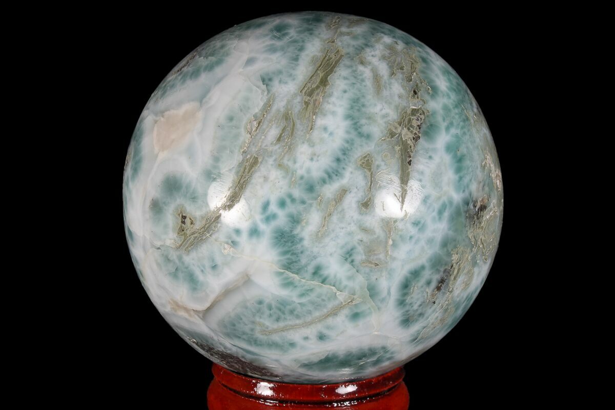This is a stunning, 2.1" wide, hand polished sphere, made from rare Larimar from the Los Chupaderos mine in the Dominican Republic. This piece is of exceptional quality with great color and flowery patterning. Comes with the pictured display stand.