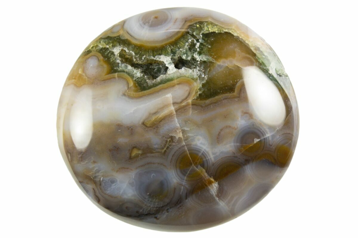 Ocean jasper is a rare type of silicified rhyolite (considered both an agate and a jasper), mined in a single location on the Ambolobozo Peninsula of northern Madagascar. The deposits are found on the coastline, hence the name, and can only be reached by boat and mined during low tide. The deposit formed as a rhyolite flow, but has been completely silicified. The rhyolitic eyes or orbs come in an astonishing array of colors and color combinations. The backgrounds can be white, pink, green, red, or yellow. Botryoidal formations as well as white and deep green druzy are also common.