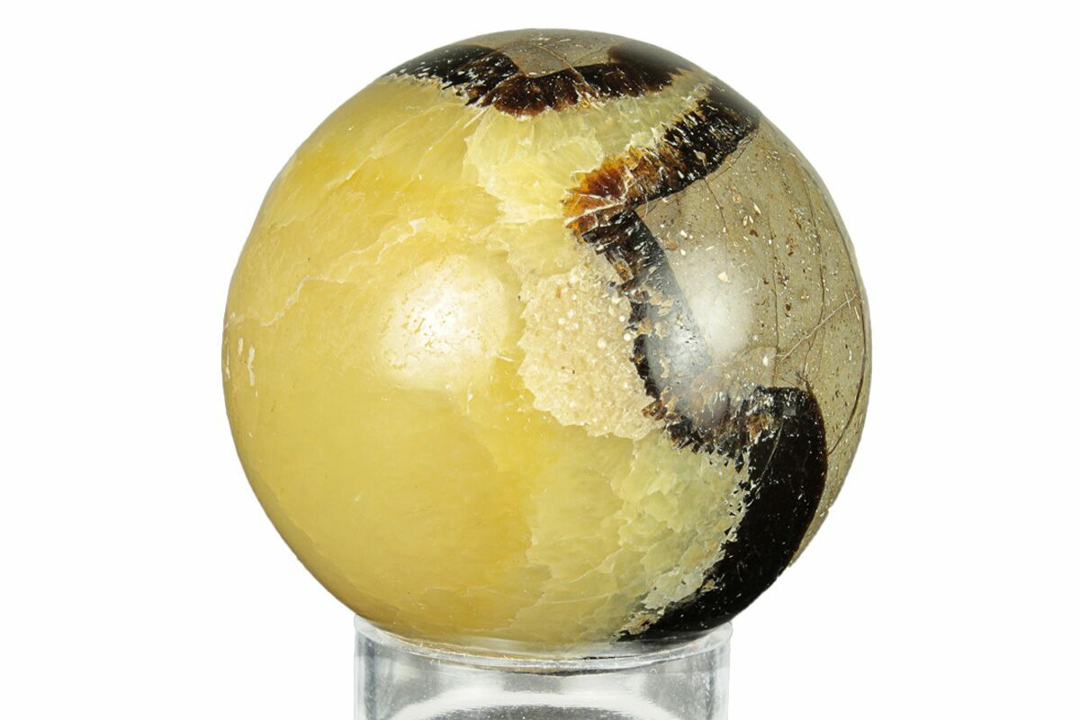 This is a beautiful polished sphere of septarian, collected from the Betsiboka Region of Madagascar and was deposited during the Jurassic period. The polishing reveals beautiful patterns of multicolored calcite sections, often creating a reptilian look: hence, septarian is often nicknamed 'dragon' stone.