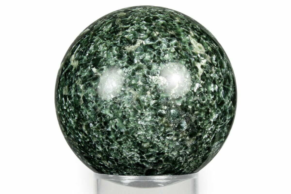 This is a 2.1" wide sphere made from a solid piece of seraphinite, collected from the Korshunovskoye Iron Skarn in Eastern Siberia. This beautiful piece has been highly polished to a glossy-finish and is accompanied by an acrylic ring display stand.