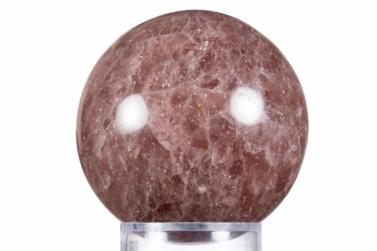 This is a 2.1" wide, polished sphere of strawberry quartz from Madagascar. It comes with an acrylic ring display stand.