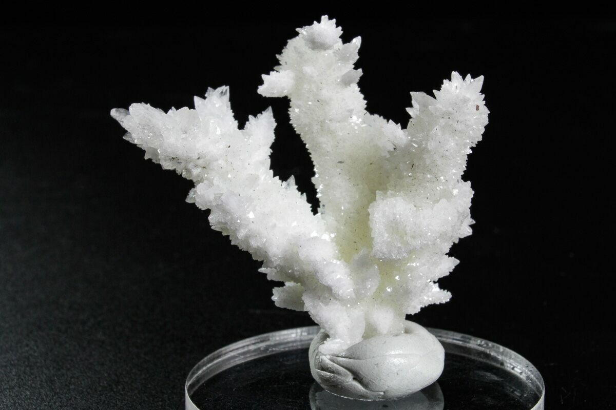 This is an interesting 2.1" tall cluster of sparkling aragonite (cave calcite) crystals, collected from the Potosi Mine in Chihuahua, Mexico. It comes mounted to a small acrylic base.