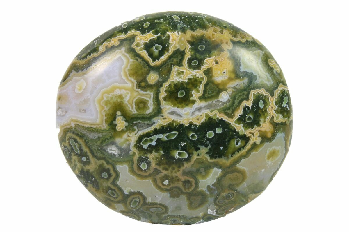Ocean jasper is a rare type of silicified rhyolite (considered both an agate and a jasper), mined in a single location on the Ambolobozo Peninsula of northern Madagascar. The deposits are found on the coastline, hence the name, and can only be reached by boat and mined during low tide. The deposit formed as a rhyolite flow, but has been completely silicified. The rhyolitic eyes or orbs come in an astonishing array of colors and color combinations. The backgrounds can be white, pink, green, red, or yellow. Botryoidal formations as well as white and deep green druzy are also common.