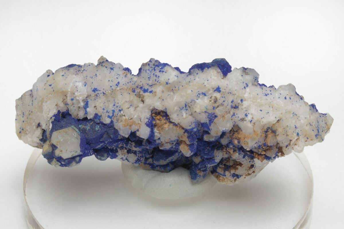 This is a vibrant specimen that features quartz crystals that are encrusted in breathtaking, vivid-blue azurite. This colorful mineral association comes out of the Guizhou Province of China. It has been mounted to an acrylic display base with mineral tack.