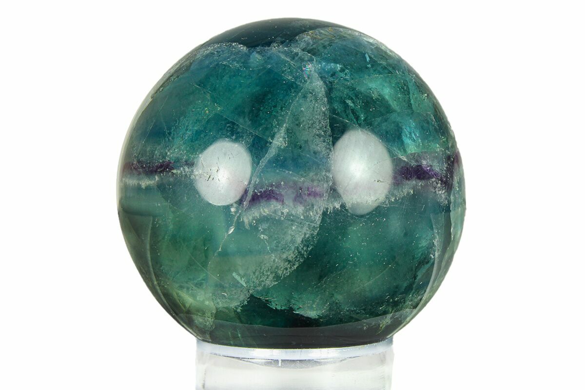 This is a colorful, 2.15" wide polished sphere made out of banded fluorite, mined in China. The quality of the polishing is excellent, revealing gorgeous layers of bright green and deep purple, and even blues and teals. Comes with the pictured display stand.