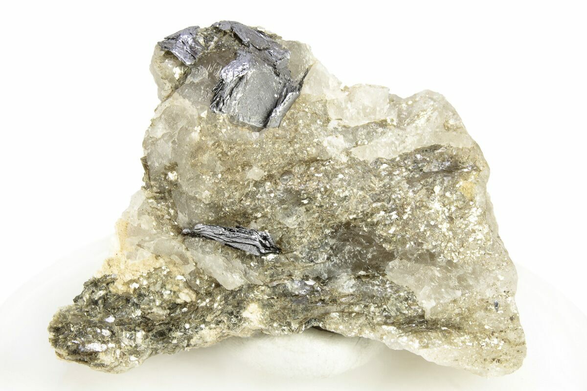 This is an aggregation of molybdenite crystals in quartz, collected from La Corne in Québec, Canada. The molybdenite formed as thin sheets that display a beautiful metallic luster. The entire specimen measures 2.15" wide and has been mounted to an acrylic display base with mineral tack.