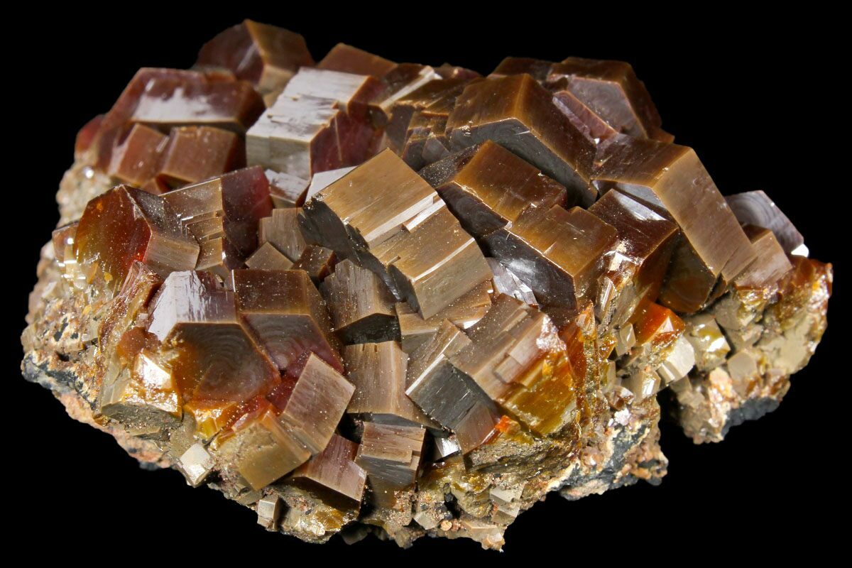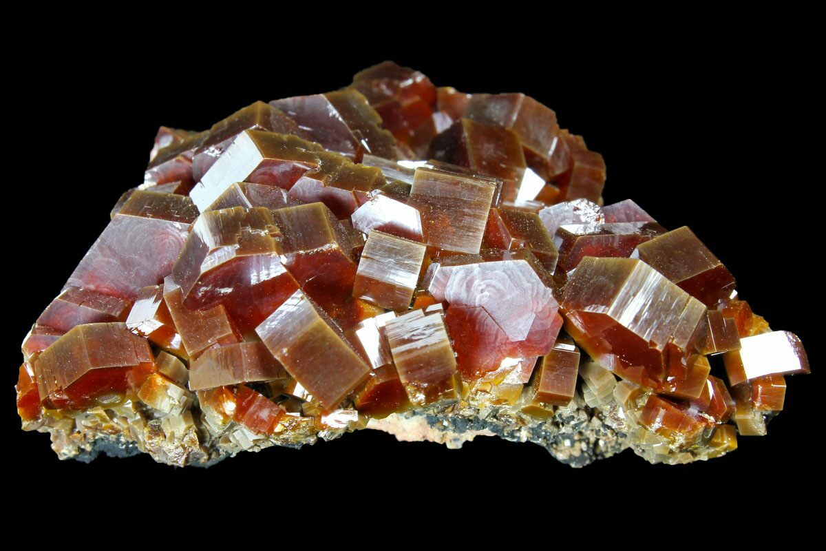 This is a beautiful aggregation of large, undamaged deep red vanadinite crystals from Midelt, Morocco. They exhibit excellent color saturation, and a mirror luster on matrix. The largest vanadinite crystal on this specimen is .5" wide!