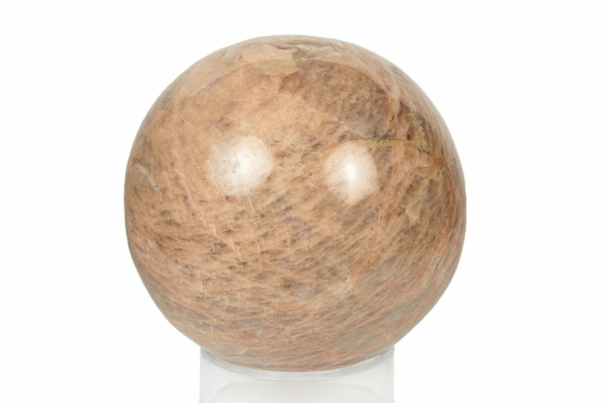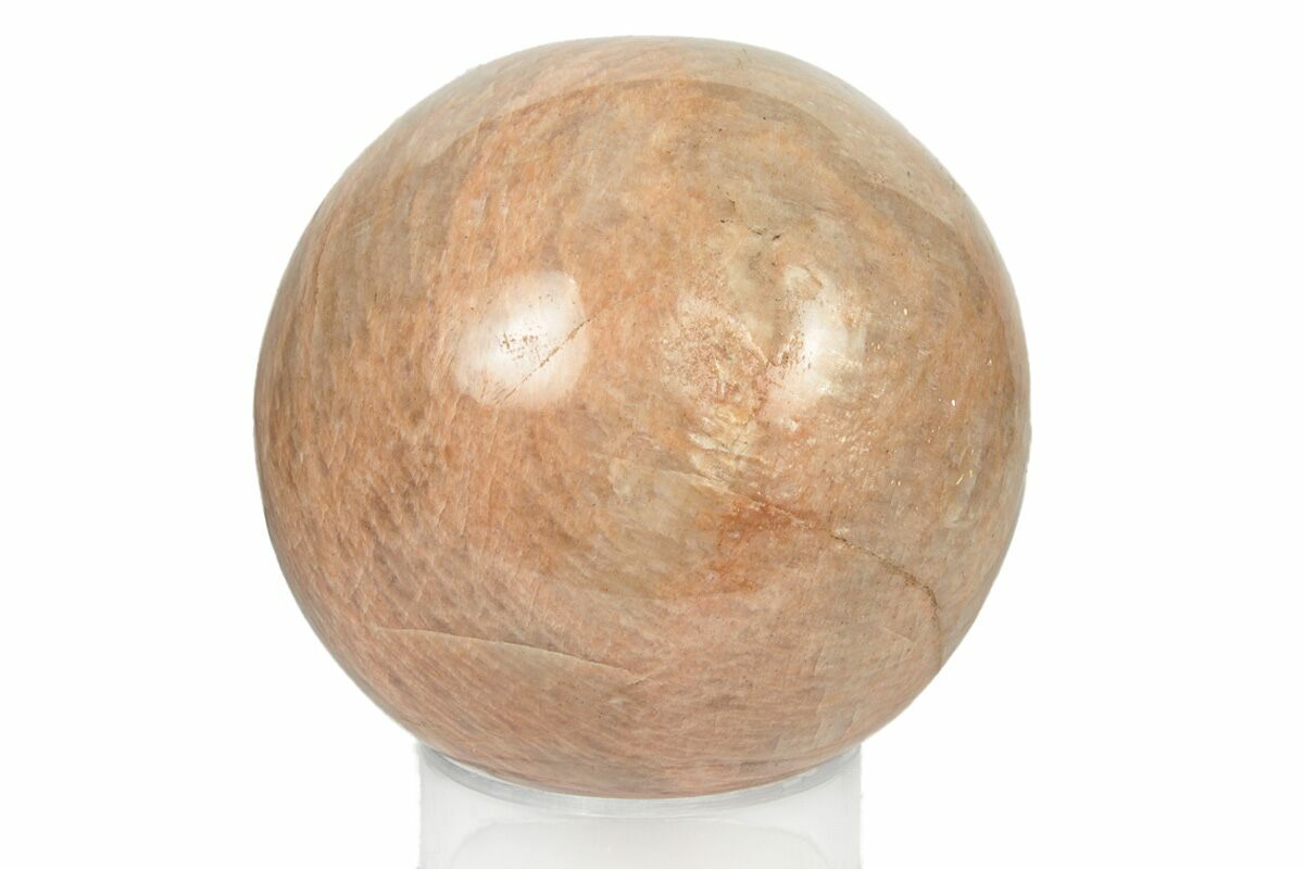 This is a polished sphere made from peach moonstone (potassium aluminum silicate feldspar) that has been shaped and polished into a sphere. An acrylic display stand will accompany the sphere.
