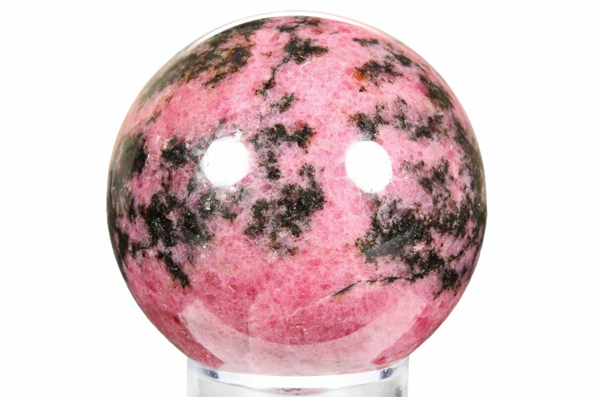 This is a beautiful, 2.15" wide, polished sphere of rhodonite from Ampanihy, Madagascar. The black veins that interrupt the pink rhodonite stone are manganese oxide. It comes with an acrylic ring display stand.