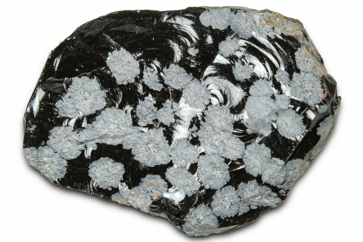 Snowflake obsidian is found near Sevier Lake in Millard County, Utah. It is a natural volcanic "glass" that forms when molten rock cools so quickly that that atoms do not have enough time to arrange themselves into crystals. Instead, the molten material solidifies into an amorphous solid called a glass. The "snowflakes" in the obsidian are small, white, radially clustered crystals of cristobalite, a mineral polymorph of silica.