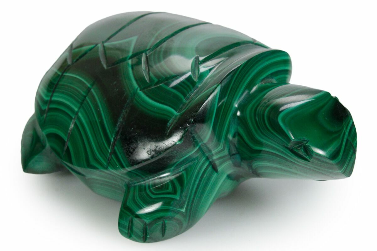 Swimming out of the ocean and crawling up your beach is this nicely carved turtle made from malachite collected from the Democratic Republic of the Congo. This is a sturdy, miniature piece that highlights the beauty of malachite with a nice, even polish. From rough mineral to polished piece, the malachite was worked by an expert craftsman to produce this statue reptile ready for display on the shelf or in the office.