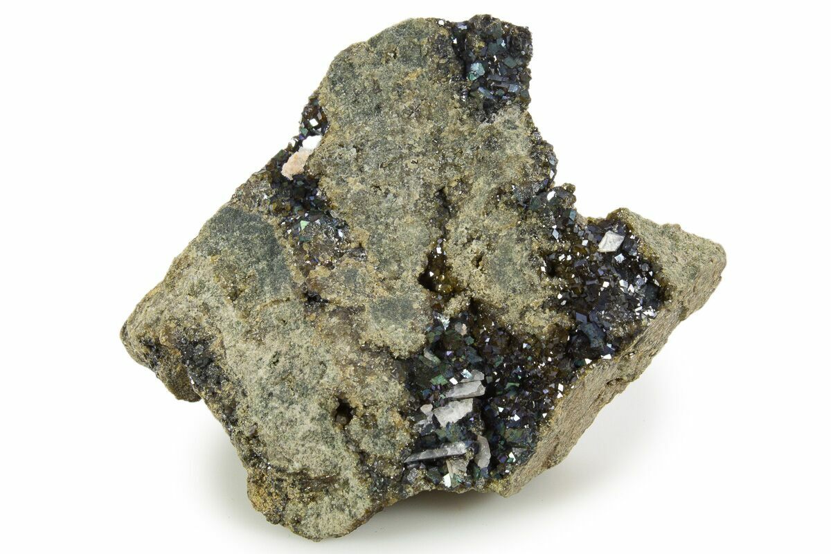 This is a stunning cluster of iridescent andradite garnets mined at Fem-minutter'n in Buskerud, Norway. The iridescence of these garnets is naturally occurring and can be attributed to two different types of lamellar structures. These lamellar structures cause predominantly thin-film interference and most likely diffraction of light.