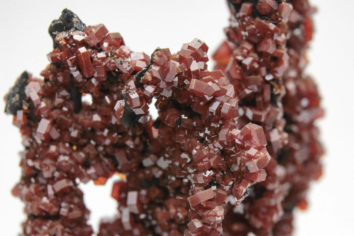 This is a beautiful formation of red vanadinite crystals on goethite stalactites, collected from Mibladen, Morocco. The vanadinite crystals have a stunning luster and completely encrust the black, botryoidal goethite.