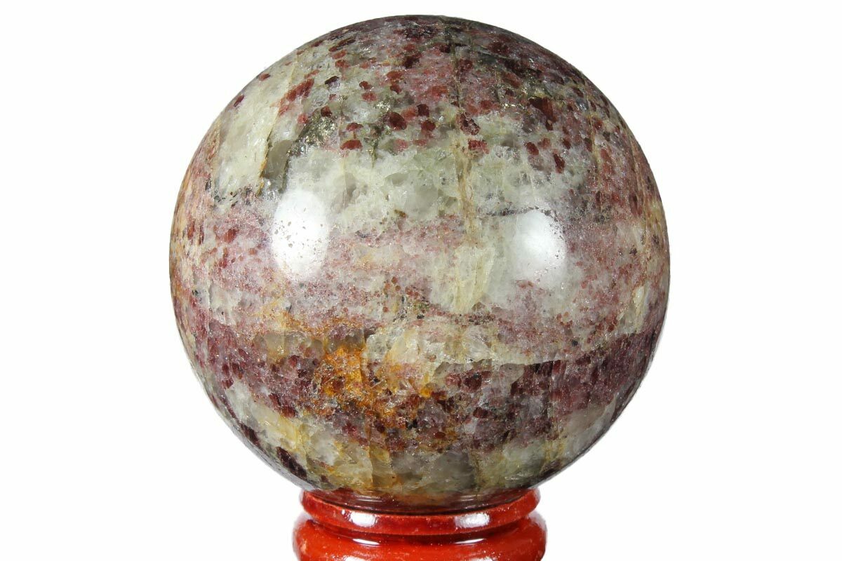 This is a 2.2" polished sphere made from Garnetite found in Madagascar.