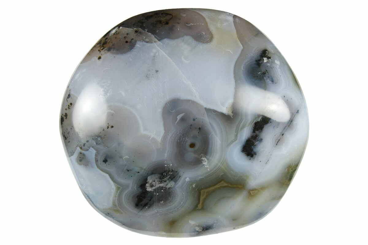 Ocean jasper is a rare type of silicified rhyolite (considered both an agate and a jasper), mined in a single location on the Ambolobozo Peninsula of northern Madagascar. The deposits are found on the coastline, hence the name, and can only be reached by boat and mined during low tide. The deposit formed as a rhyolite flow, but has been completely silicified. The rhyolitic eyes or orbs come in an astonishing array of colors and color combinations. The backgrounds can be white, pink, green, red, or yellow. Botryoidal formations as well as white and deep green druzy are also common.