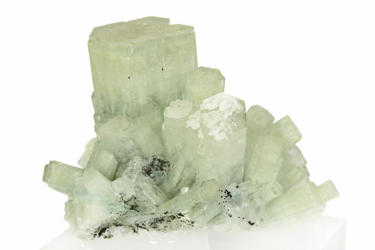 This is an incredibly beautiful 2.2" wide cluster of goshenite crystals from the Erongo Mountains of Namibia. All of the crystals exhibit an exceptional luster and pristine terminations. The specimen has been mounted to an acrylic display base.