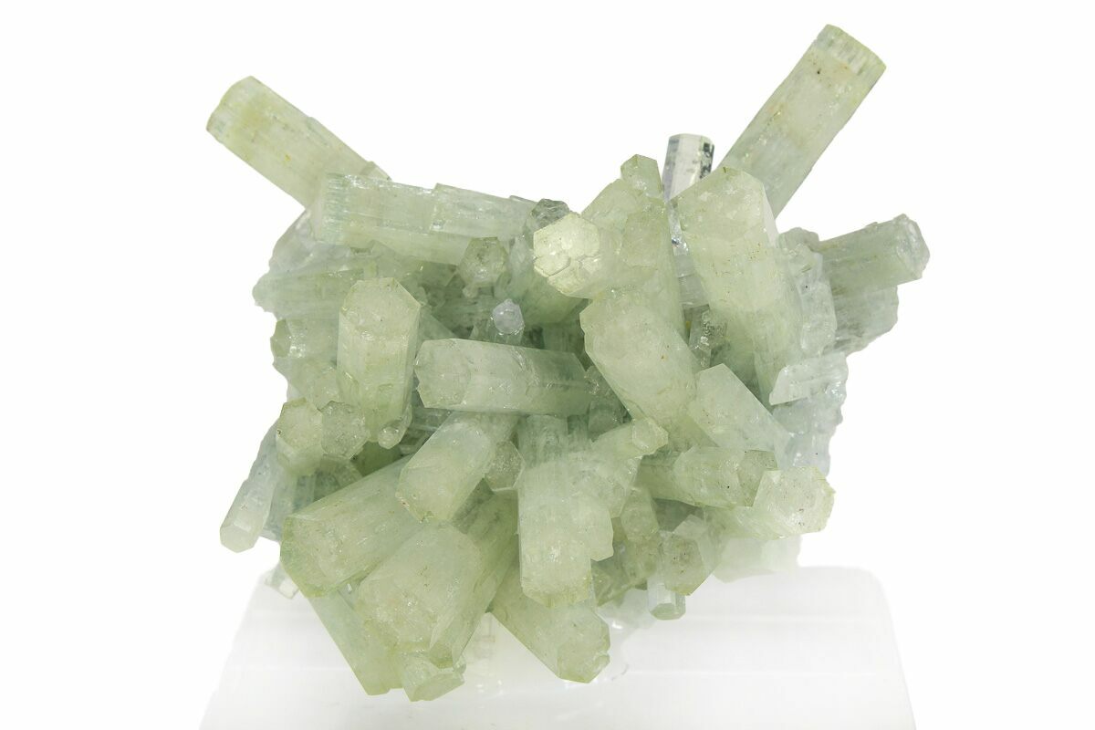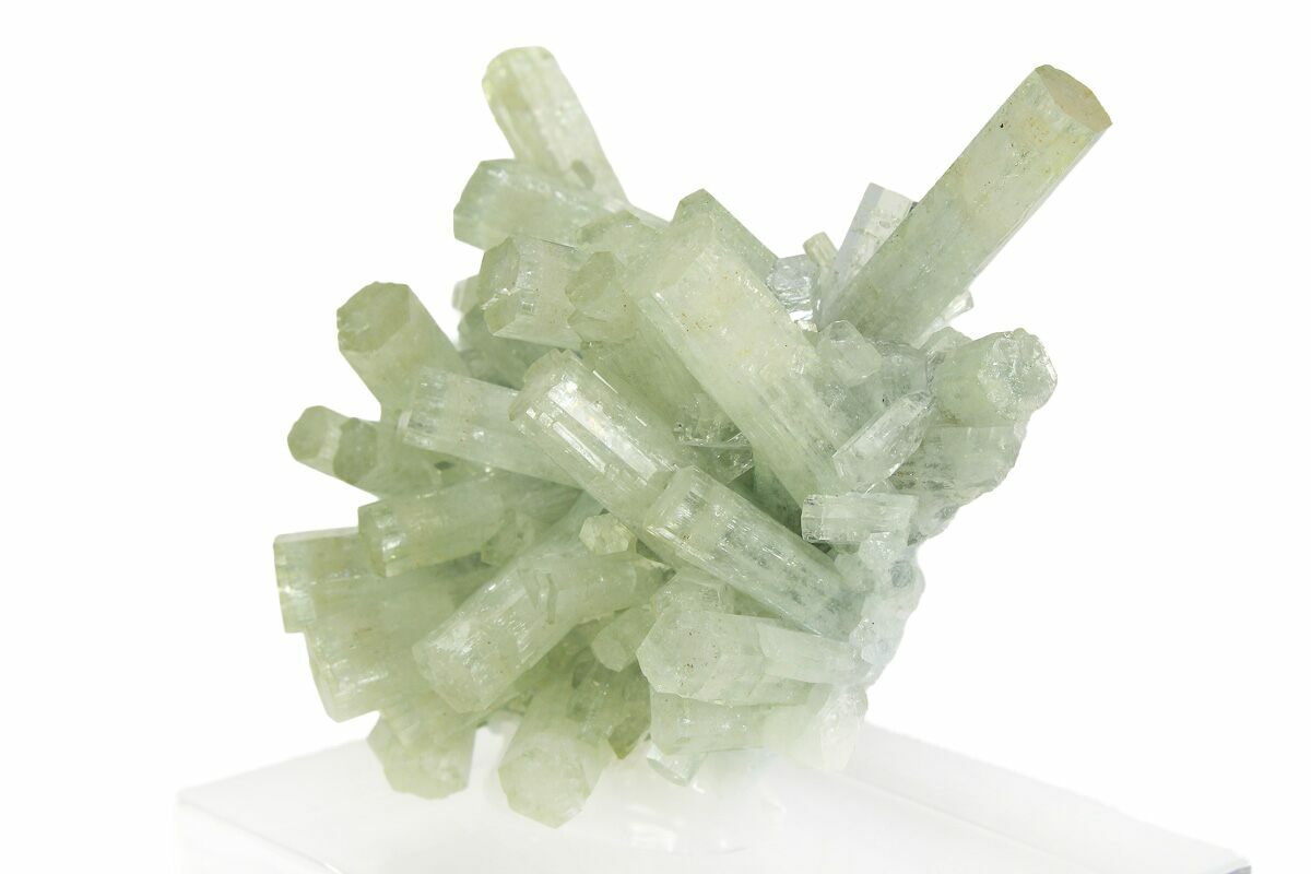 This is an incredibly beautiful 2.2" wide cluster of goshenite crystals from the Erongo Mountains of Namibia. All of the crystals exhibit an exceptional luster and pristine terminations. The specimen has been mounted to an acrylic display base.