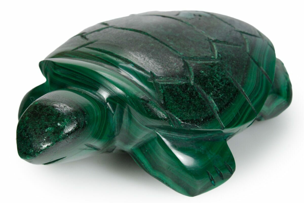 Swimming out of the ocean and crawling up your beach is this nicely carved turtle made from malachite collected from the Democratic Republic of the Congo. This is a sturdy, miniature piece that highlights the beauty of malachite with a nice, even polish. From rough mineral to polished piece, the malachite was worked by an expert craftsman to produce this statue reptile ready for display on the shelf or in the office.