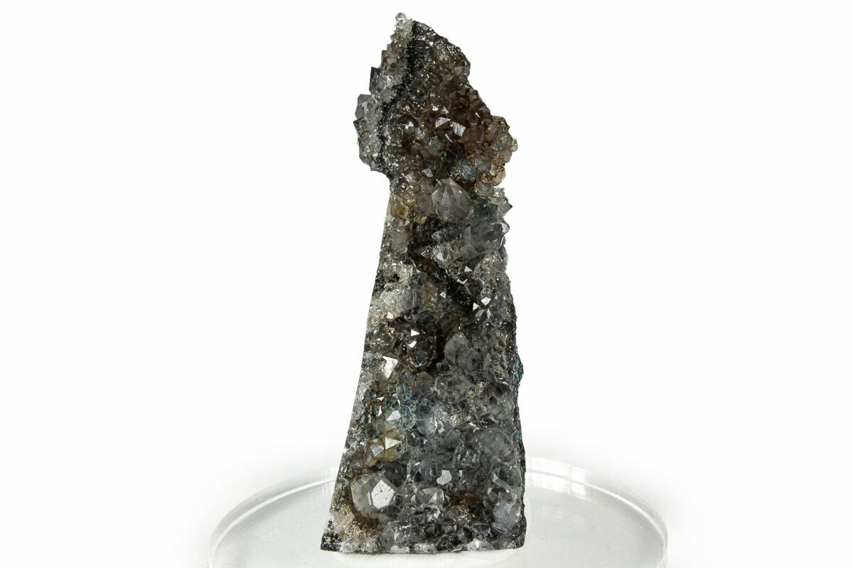This is a beautiful cluster of glassy quartz crystals that formed over aggregations of sky-blue to deep blue plancheite, collected from the Sanda Hills occurrences (Sanda mine) in the Republic of the Congo. This mine has been closed since 2019, so this material is old stock. The entire specimen is 2.25" wide and comes with mineral tack and an acrylic display base.