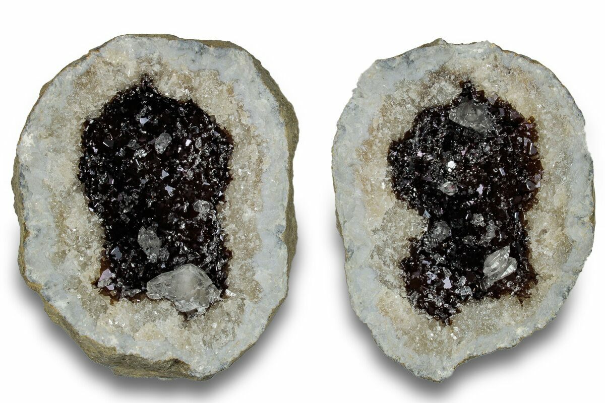 This is a sparkling 2.25" wide keokuk geode collected from Lewis County, Missouri. It has been cracked open to reveal an interior lined with pearly clear and iridescent, deep brown calcite crystals. Both halves are included with this purchase.