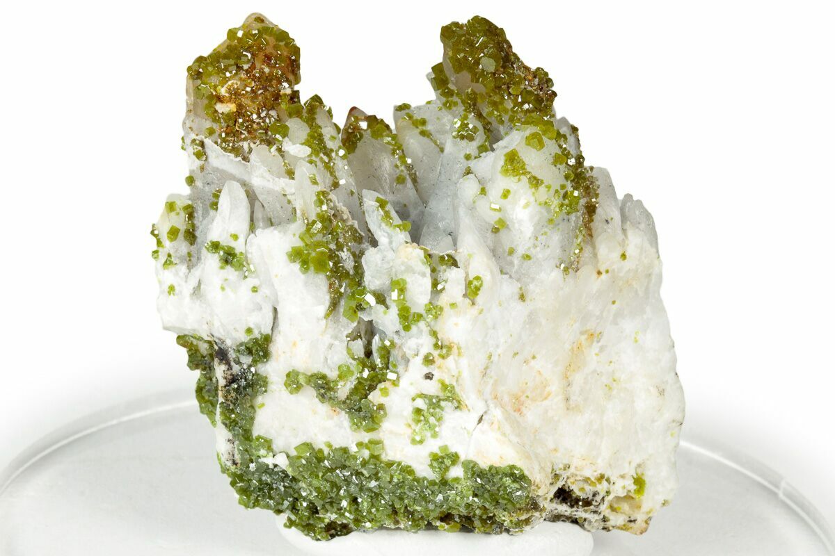 This is a 2.25" wide cluster lustrous, forest-green pyromorphite crystals from the Yanhshuo mine in the Guangxi Zhaung Autonomous Region of China. The pyromorphite formed over well-formed quartz crystals. It has been mounted to an acrylic display base with mineral tack.