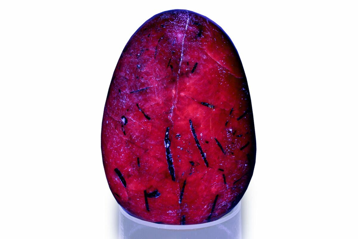 This is a 2.25" wide polished egg made from red corundum (Ruby). Under shortwave UV light, this specimen exhibits a vibrant red fluorescence.