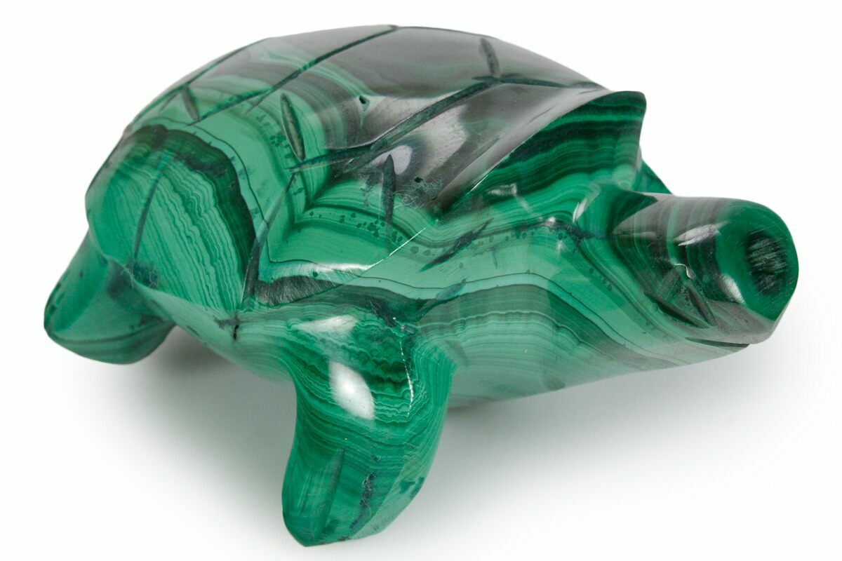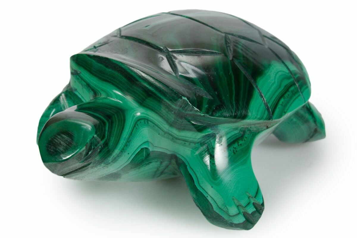 Swimming out of the ocean and crawling up your beach is this nicely carved turtle made from malachite collected from the Democratic Republic of the Congo. This is a sturdy, miniature piece that highlights the beauty of malachite with a nice, even polish. From rough mineral to polished piece, the malachite was worked by an expert craftsman to produce this statue reptile ready for display on the shelf or in the office.