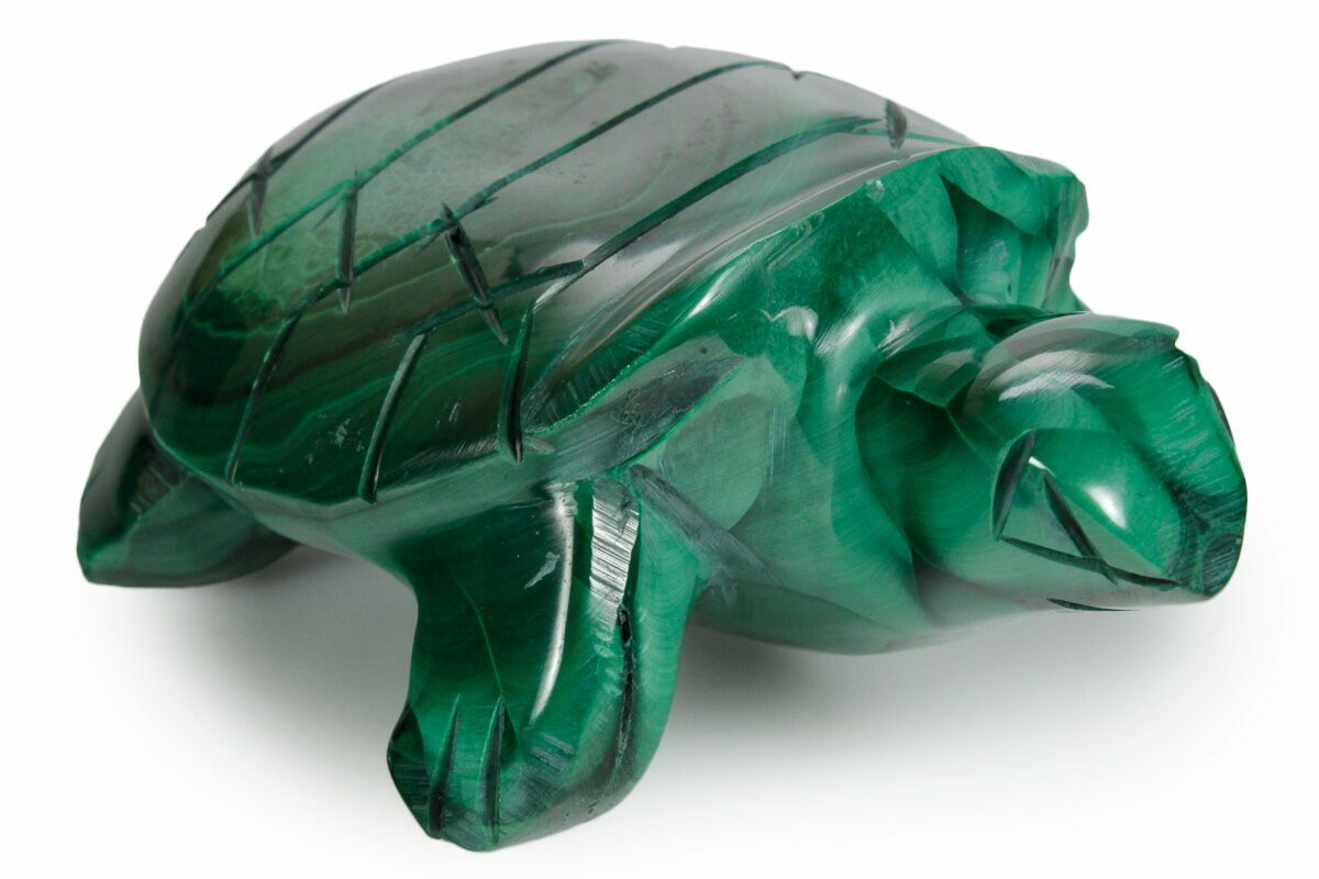 Swimming out of the ocean and crawling up your beach is this nicely carved turtle made from malachite collected from the Democratic Republic of the Congo. This is a sturdy, miniature piece that highlights the beauty of malachite with a nice, even polish. From rough mineral to polished piece, the malachite was worked by an expert craftsman to produce this statue reptile ready for display on the shelf or in the office.