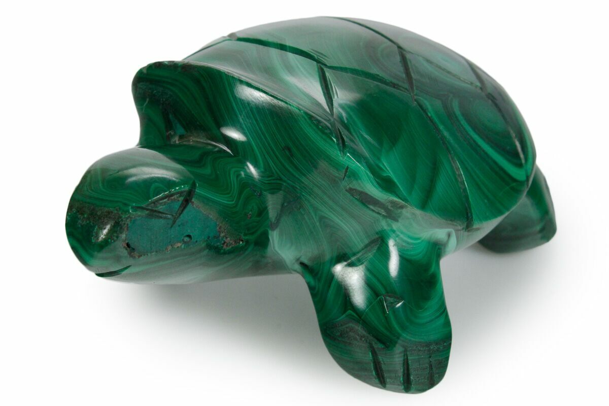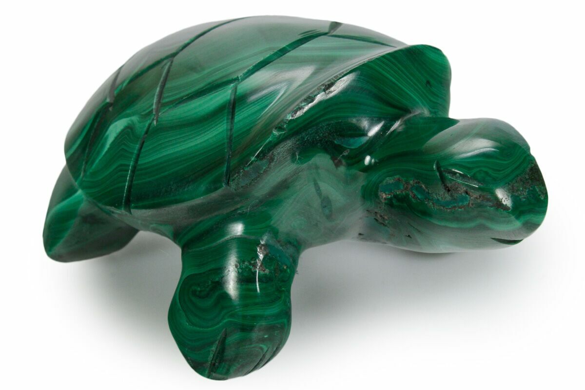 Swimming out of the ocean and crawling up your beach is this nicely carved turtle made from malachite collected from the Democratic Republic of the Congo. This is a sturdy, miniature piece that highlights the beauty of malachite with a nice, even polish. From rough mineral to polished piece, the malachite was worked by an expert craftsman to produce this statue reptile ready for display on the shelf or in the office.