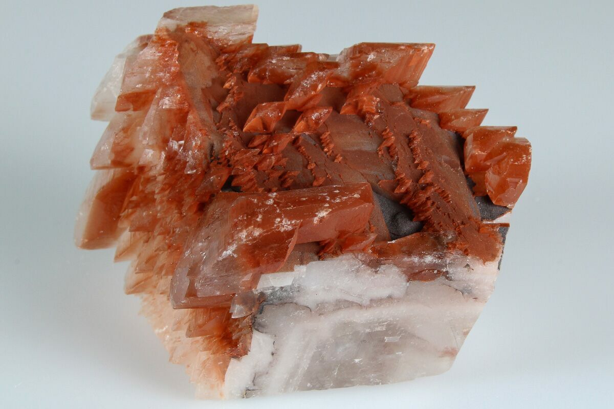 This is a fascinating cluster of lustrous "pagoda calcite" (also known as "mushroom calcite" and "poker chip calcite") crystals that formed over a scalenohedral calcite crystal. The pagoda-style calcite crystals contain hematite inclusions which give them their red coloration. This specimen was collected from the Fengjiashan Mine (Daye Copper mine) in the Hubei Province of China and under shortwave UV, they react by fluorescing a vibrant orange color.