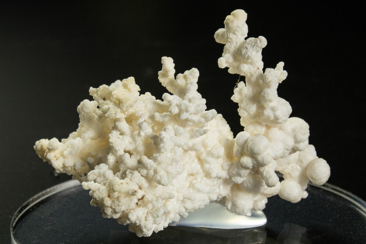This is an incredible 2.3" cluster of marshmallowy white aragonite crystals from Eureka County, Nevada. The specimen glows a ghostly white under short-wave UV light. They were most likely collected from caves interconnecting the Diamond Mine system.