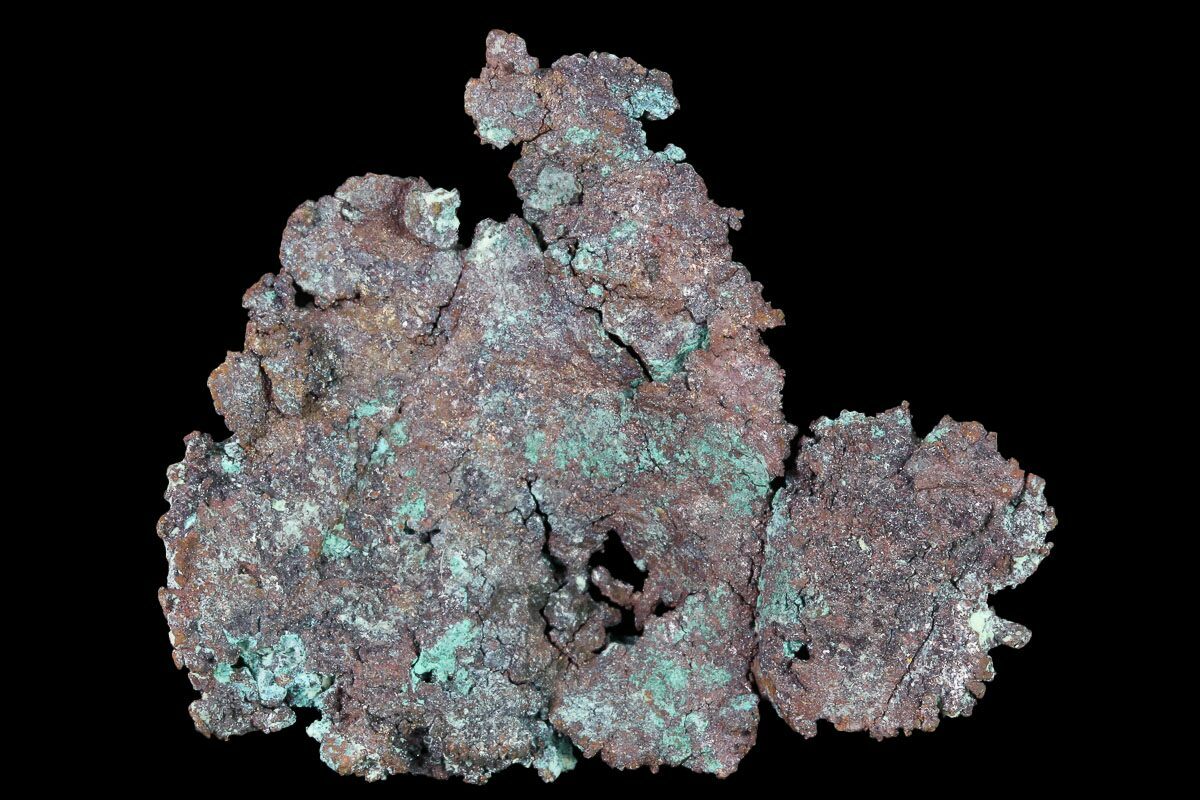 Native copper occurs rarely as isometric cubic and octahedral crystals, but more typically as irregular masses and fracture fillings. It has a reddish, orangish, and/or brownish color on fresh surfaces, but typically is weathered and coated with a green tarnish of copper carbonate.