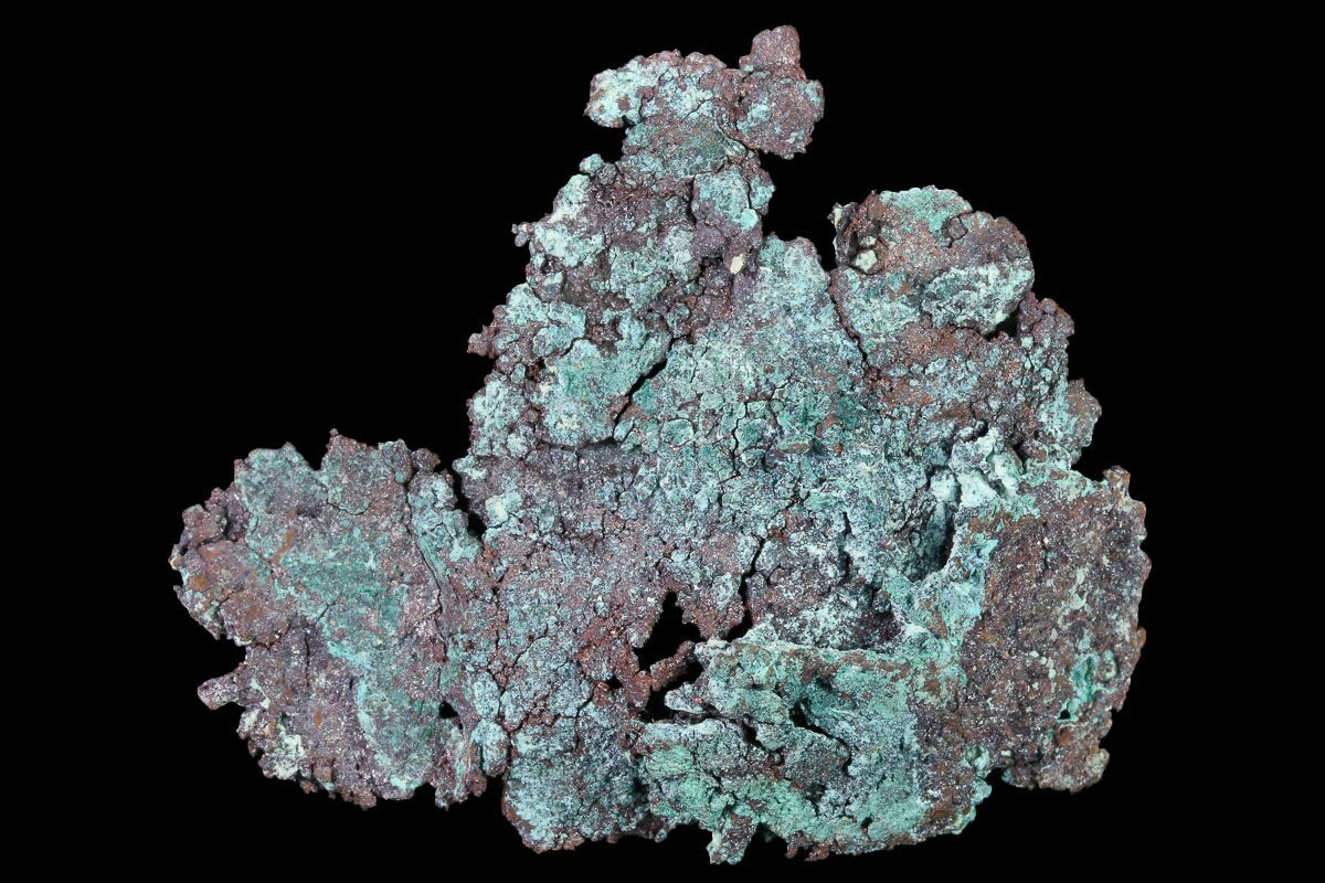 This is a natural formation of native copper with cuprite, mined from the Carissa Pit in the Battle Mountain Mining District of Nevada. It has a green and brown patina and has been prepped free from the matrix it was found in.