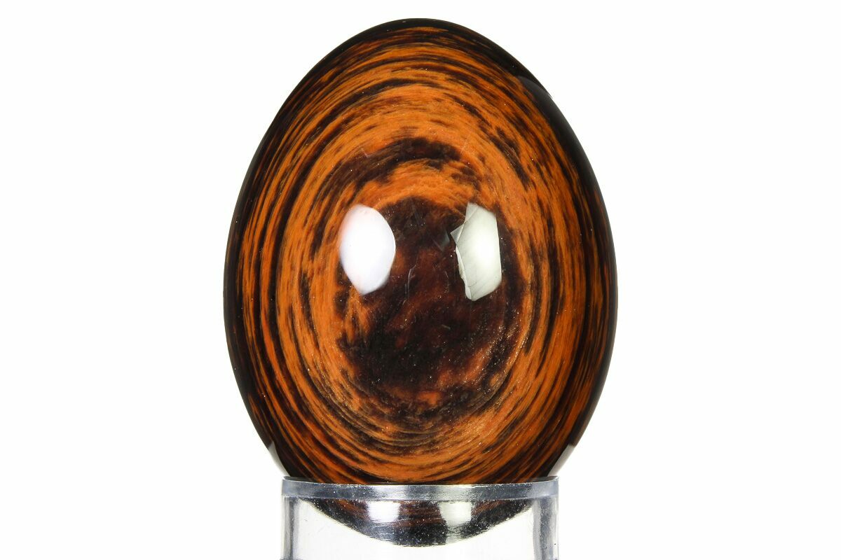 This is a 2.3" tall mahogany obsidian egg, collected from Mexico. This obsidian specimen has been polished, revealing the swirls and streaks of red/orange color that give this form of obsidian its name.