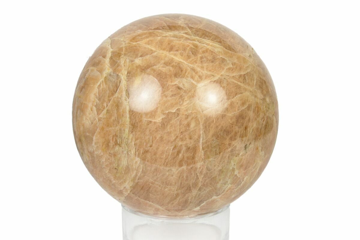 This is a polished sphere made from peach moonstone (potassium aluminum silicate feldspar) that has been shaped and polished into a sphere. An acrylic display stand will accompany the sphere.