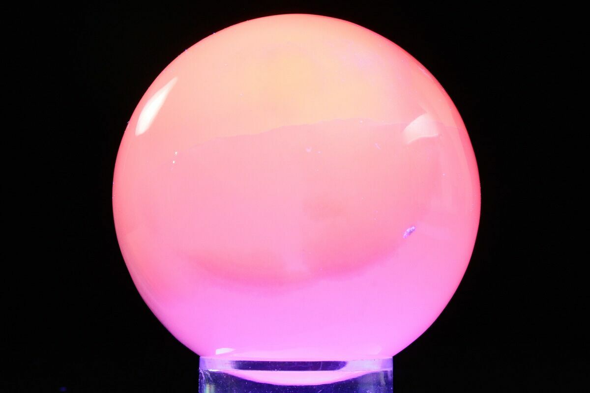 This is a gorgeous pink, 2.3" wide polished manganoan (mangano) calcite sphere. It has been expertly polished to a glossy finish all the way around, highlighting the natural banding of the mineral. This calcite exhibits an intense orange fluorescence under shortwave UV light.