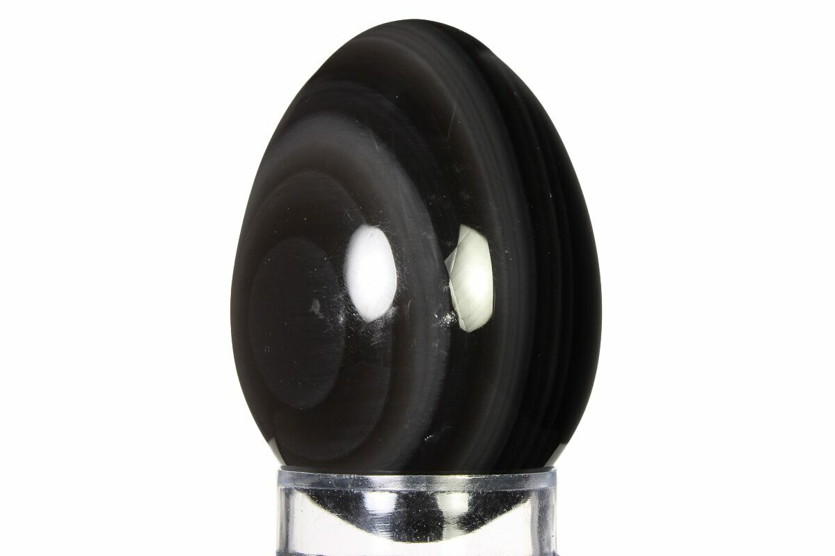 This is a 2.3" tall rainbow obsidian egg. This interesting stone is mined near Davis Creek in Northern California. Comes with an acrylic ring display base