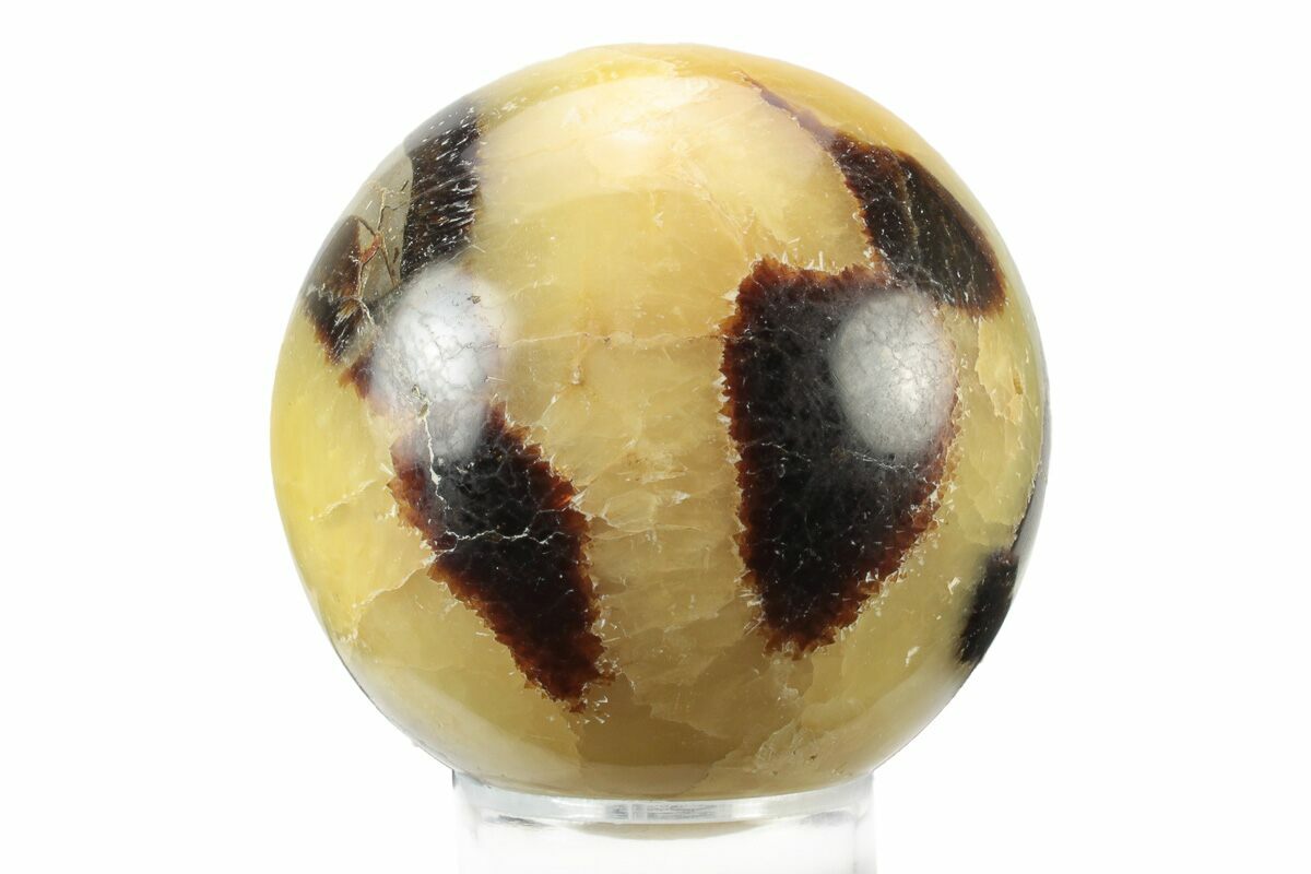 This is a beautiful, polished sphere of septarian. The septarian comes from the Betsiboka Region of Madagascar and was deposited during the Jurassic period. The polishing reveals a beautiful pattern, often causing these spheres to be called dragon spheres as they remind people of what they imagine dragon skin looking like.