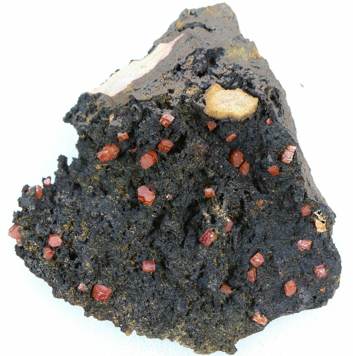 This specimen contains lustrous red Vanadinite crystals, naturally displayed on an iron-manganese oxide matrix.