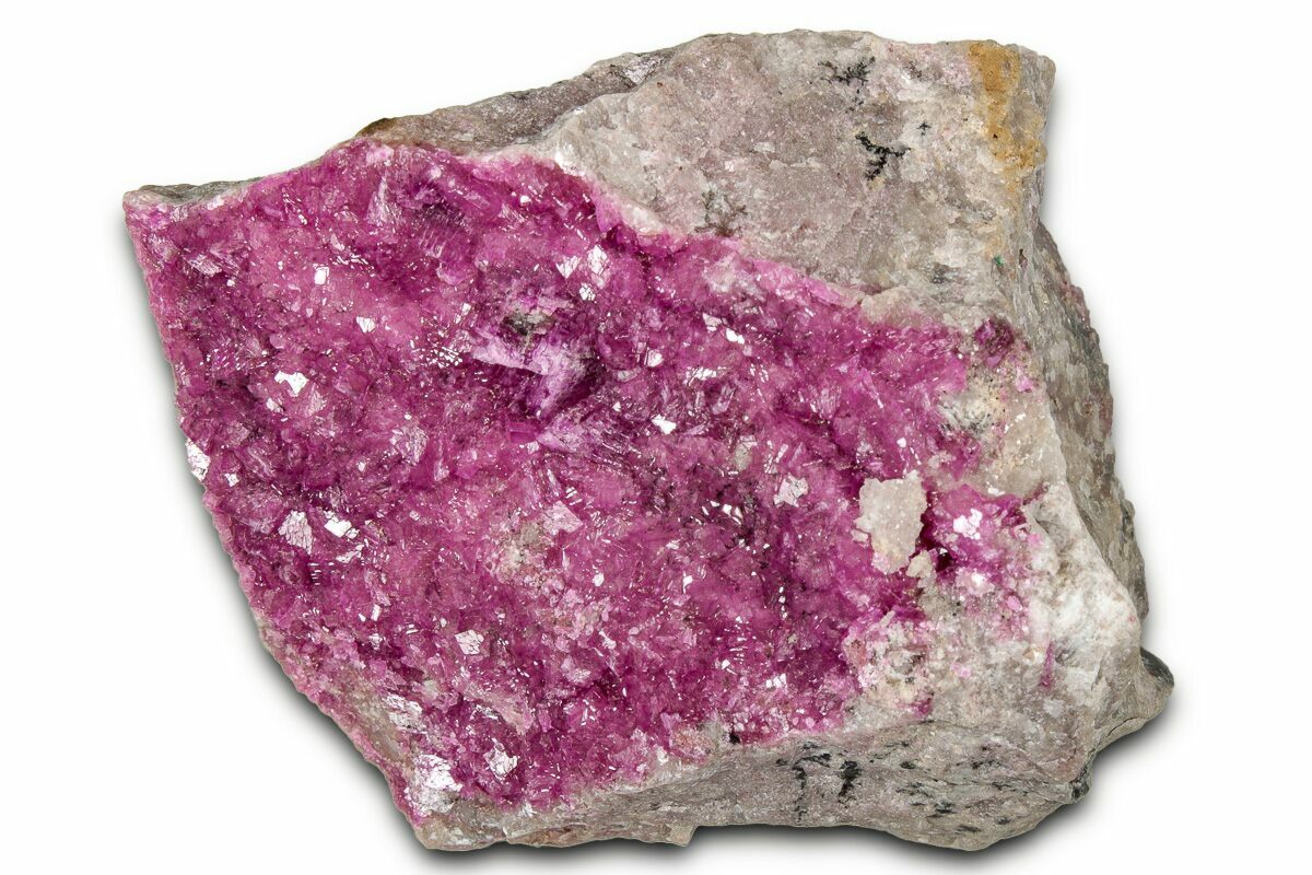 Cobaltoan dolomite is a vibrant, pink to purplish-pink variety of the mineral dolomite that owes its striking coloration to traces of cobalt. This rare and visually distinctive mineral is typically found as crystalline coatings or rhombohedral crystals on matrix, often associated with cobalt-bearing minerals such as erythrite. The vivid hue and lustrous crystal surfaces make cobaltoan dolomite a favorite among mineral collectors. It is most famously sourced from the Katanga region in the Democratic Republic of the Congo, where some of the world’s finest specimens have been found. Though chemically similar to regular dolomite (CaMg(CO₃)₂), the substitution of cobalt in place of magnesium during formation gives it its unmistakable color.