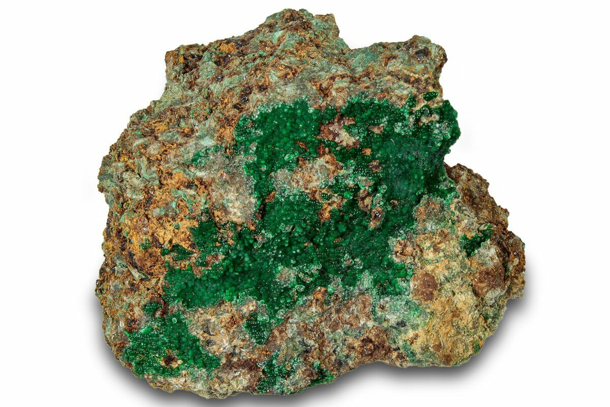 Conichalcite is an arsenate mineral that forms as a secondary mineral in the oxidized zones of copper deposits. Often it will bear a vibrant green color, though it will display a variety of colors from grass-green to yellow-green. It is the arsenic-rich end member of the series, and calciovolborthite is the vanadium-rich end member.